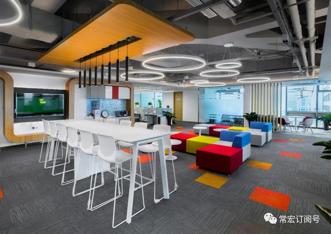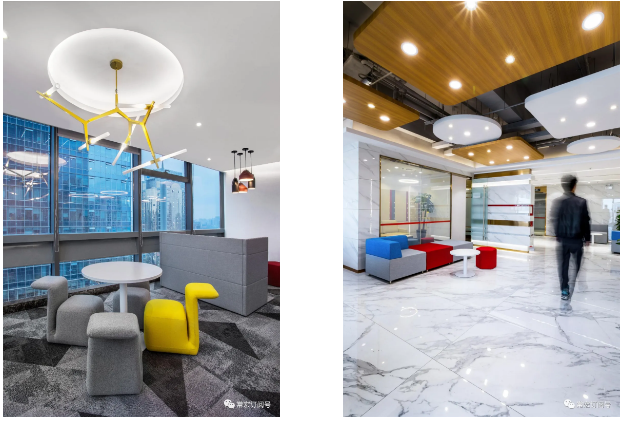 這種風(fēng)格貫穿始終,同時也在燈具上被體現(xiàn)出來,主要空間采用了細長的磁吸燈具,顯得頂面干凈簡潔,細長深色的磁吸燈和吊掛軌道燈又能夠襯托出工業(yè)風(fēng)格。此外,設(shè)計師根據(jù)不同空間屬性變化,在空間中點綴工銀安盛的VI跳色,使整體增添了親切、溫暖、靈動的感覺。